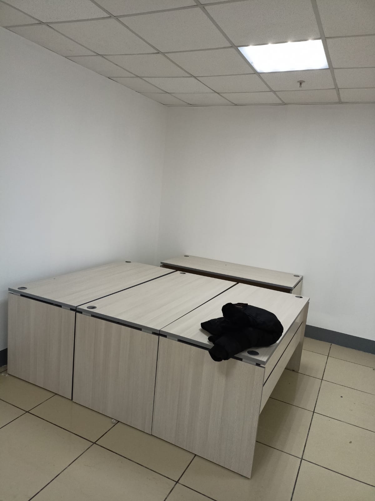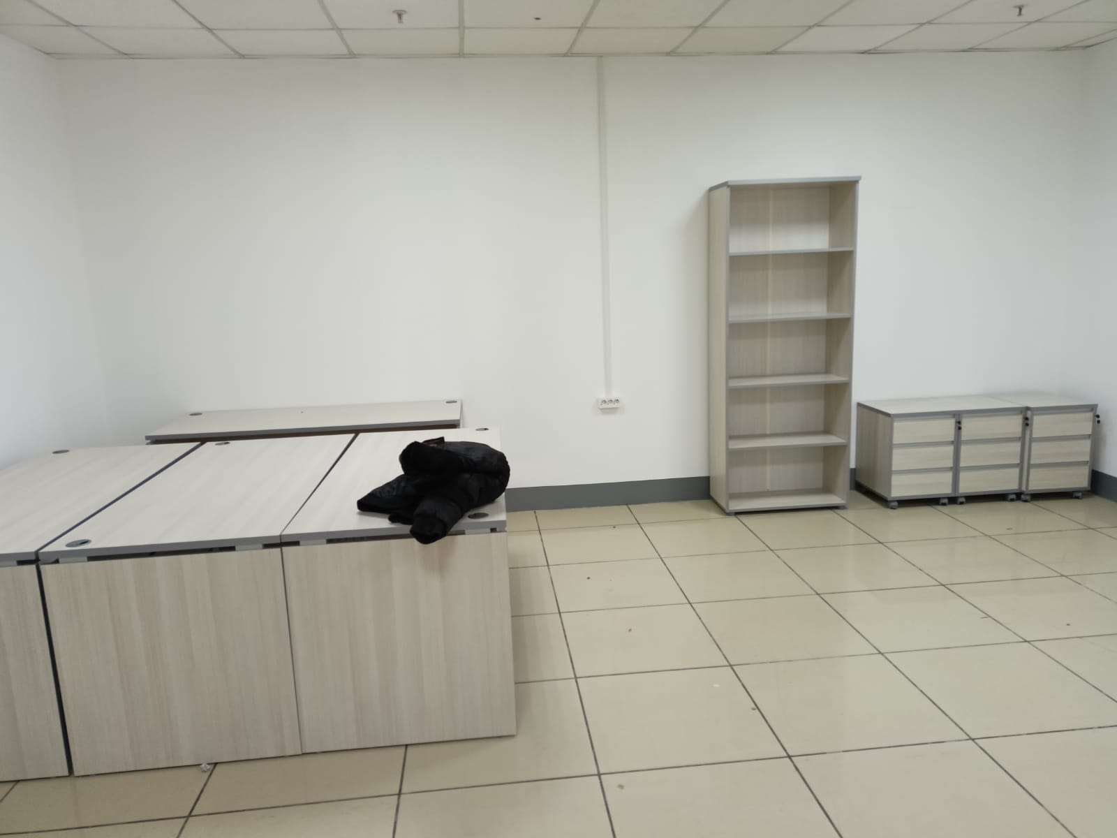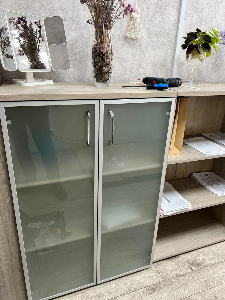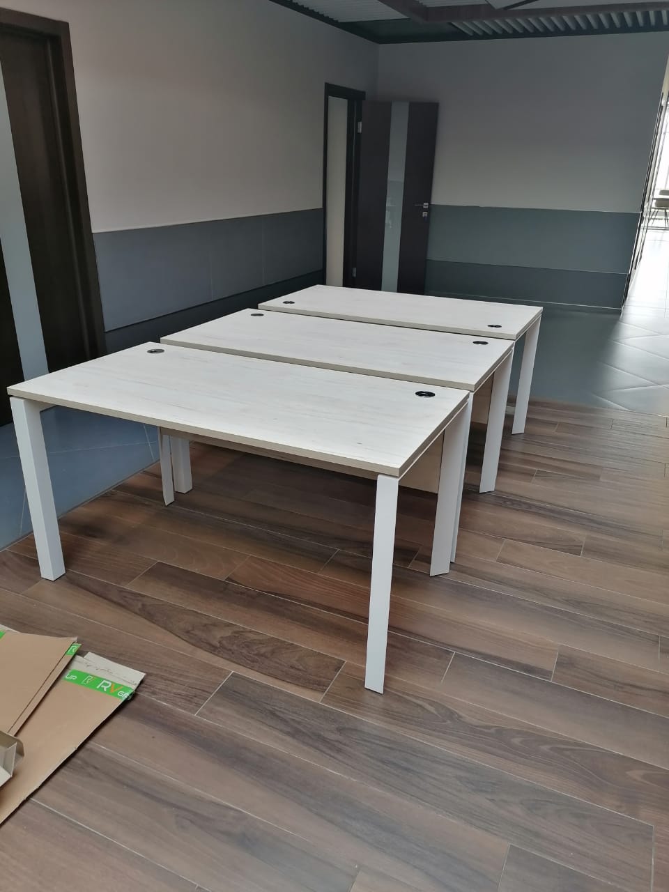 Разместим стулья, офисные столы и стеклянные журнальные столики, тумбочки по дизайн-плану (оставим проходы к пожарному выходу, окнам, выключателям).