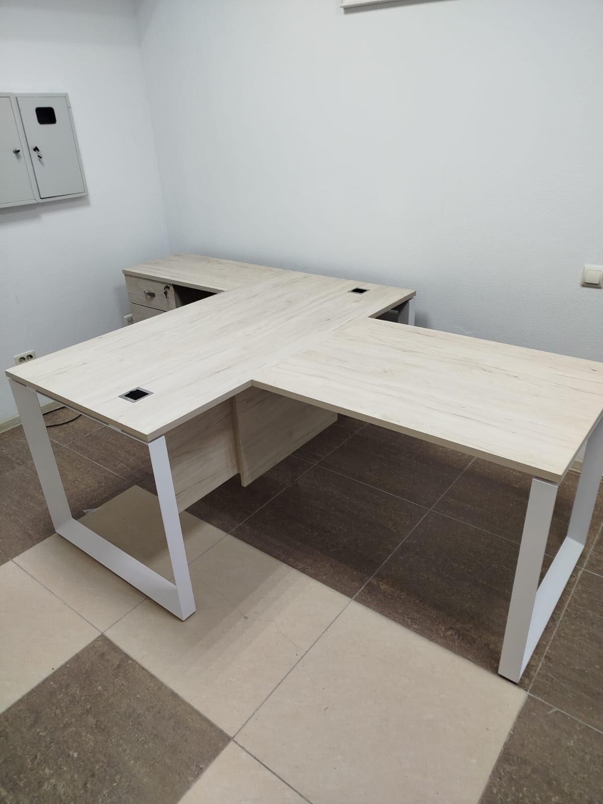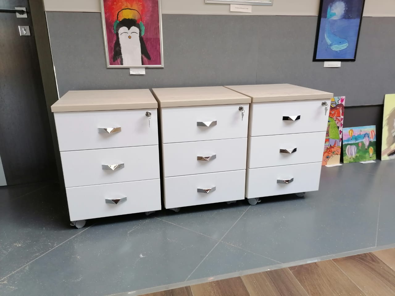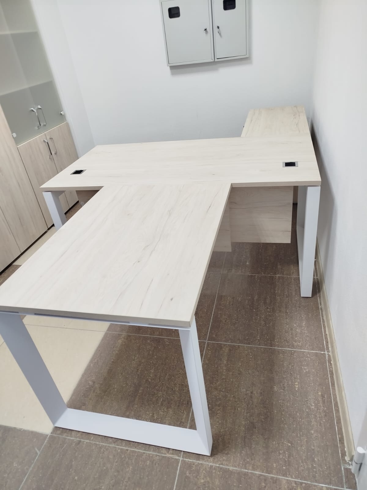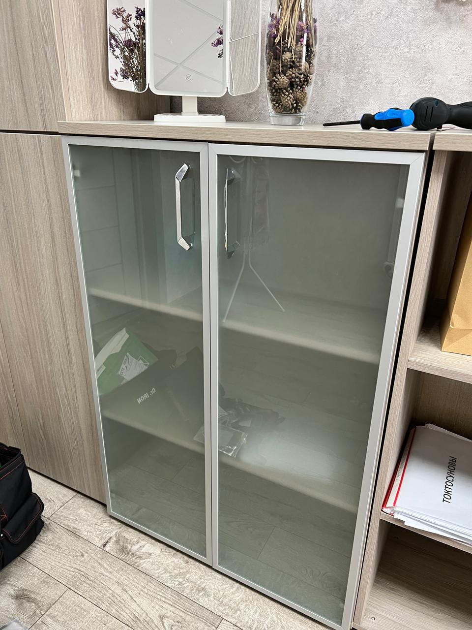 Разместим стулья, офисные столы и стеклянные журнальные столики, тумбочки по дизайн-плану (оставим проходы к пожарному выходу, окнам, выключателям).