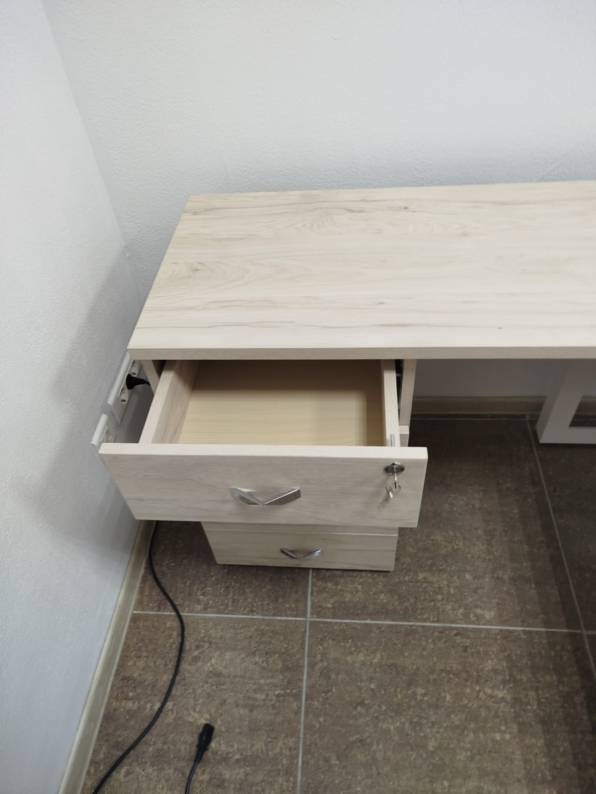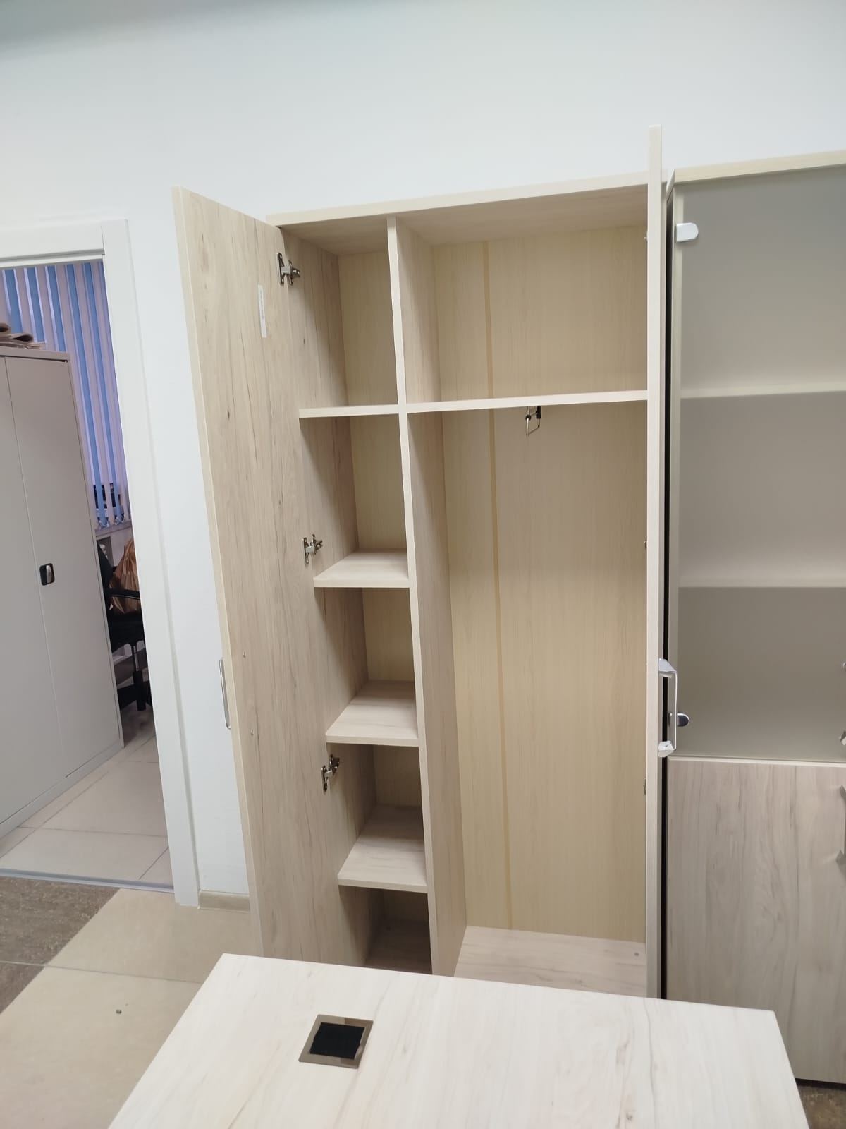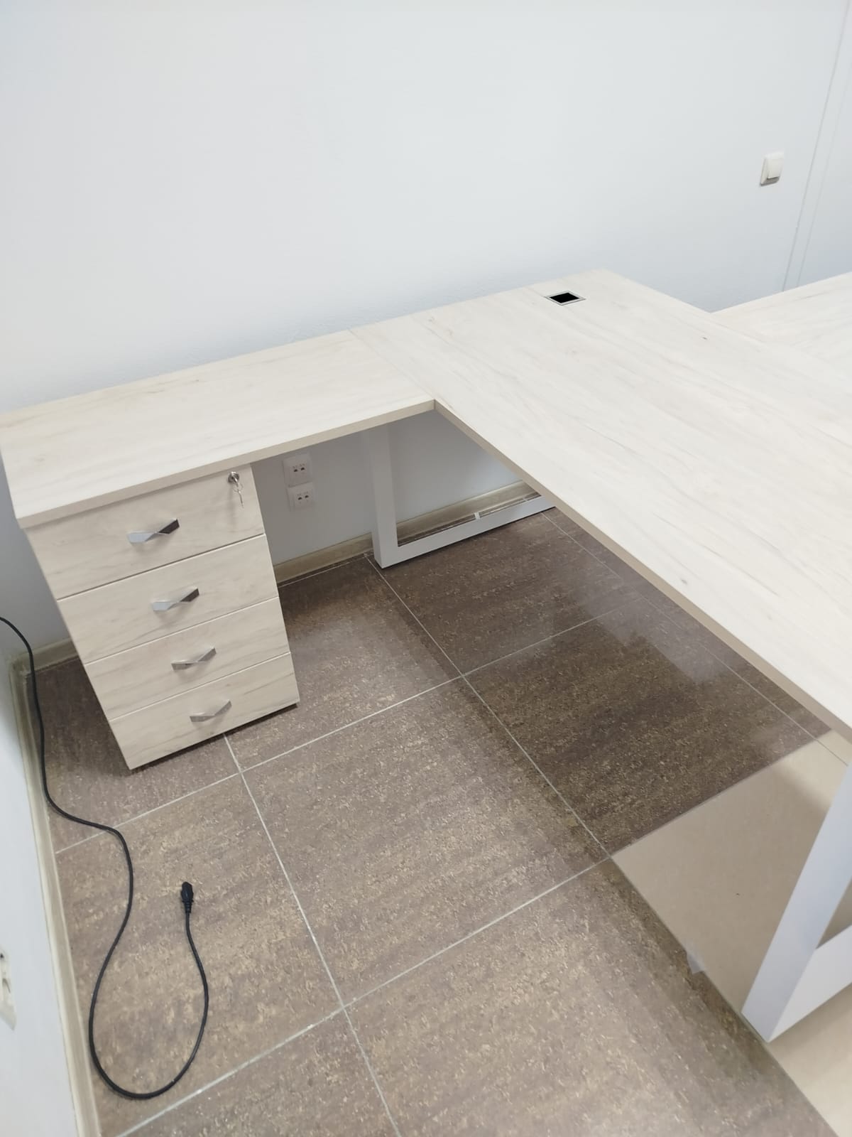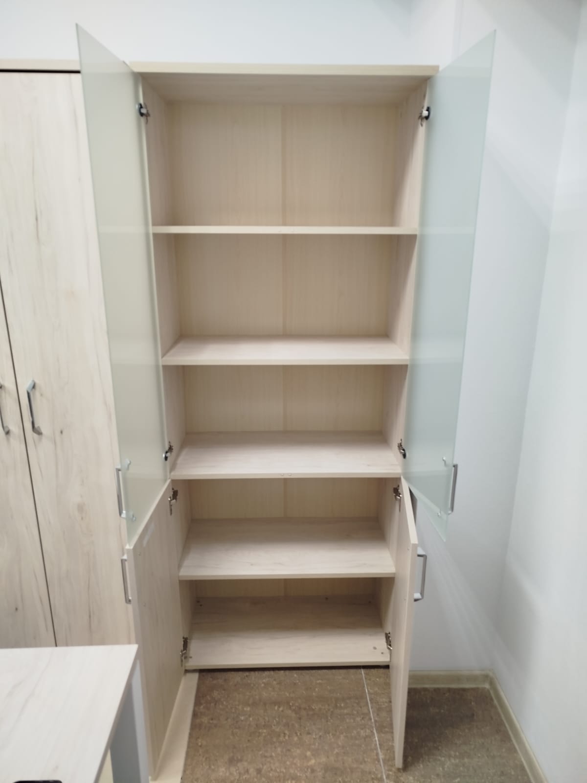 Разместим стулья, офисные столы и стеклянные журнальные столики, тумбочки по дизайн-плану (оставим проходы к пожарному выходу, окнам, выключателям).